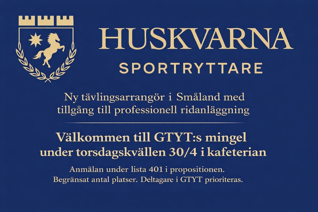 Under torsdagskvällen (30 april) sker ett GTYT-mingel i kafeterian sponsrat av Stall Karleby och Föreningsekonomen. Stefan Fur från Dunstan är moderator. Lasse Berglund talar om sina erfarenheter av unghästar och bedömning. Stefan Willebrand från Föreningsekonomen pratar om smarta ekonomilösningar för föreningar. Det bjuds på tapastallrik samt dryck. Antalet platser är begränsade och delas i första hand ut till ryttare i GTYT, därefter andra ryttare.